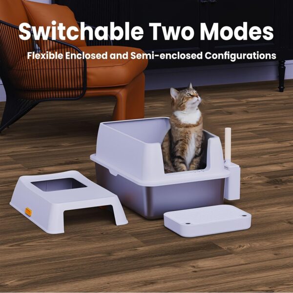 Featuring an easy-to-assemble modular system, our stainless steel litter box offers both enclosed litter box and semi-enclosed configurations to suit various needs. The enclosed setup provides a private space for your cat, effectively keeping litter and odors contained, while the semi-enclosed option caters to cats preferring more open spaces and simplifies cleanup for owners.